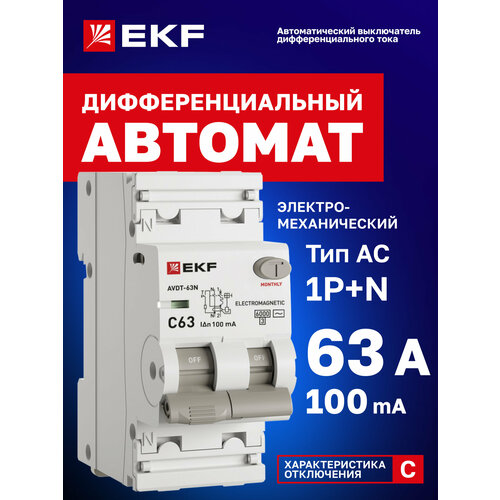 Дифавтомат EKF PROXIMA АВДТ-63N 63А (C) 100мА, тип AC, 1P+N (двухполюсный), 6кА, электромеханический
