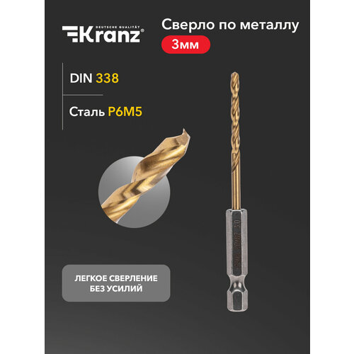 Сверло по металлу, 3мм, Р6М5, титан, шестигранный хвостовик (1 шт. в упаковке) DIN 338 KRANZ, цена за 1 упак