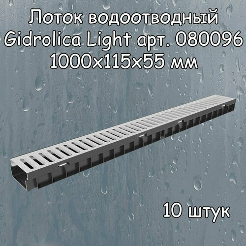 10 штук лоток водоотводный 1000х115х55 мм Gidrolica Light с оцинкованной щелевой решеткой DN100 (А15), артикул 080096