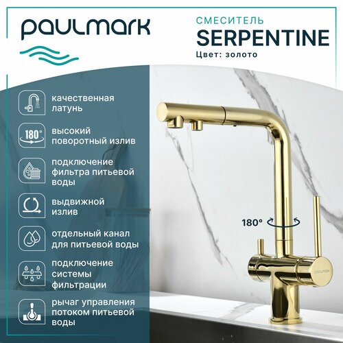 Смеситель для кухни с выдвижным изливом Paulmark SERPENTINE золото, с подключением фильтра питьевой воды, Se213222-G