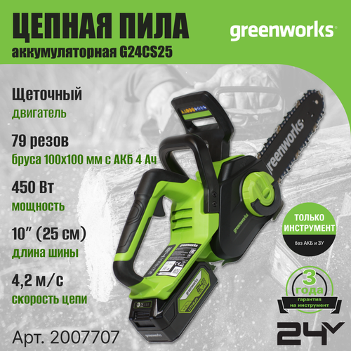 Цепная пила аккумуляторная Greenworks 2007707, 24V, 25см, без АКБ и ЗУ