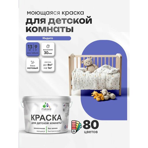 Краска акриловая (АК) Malare Краска Malare интерьерная для детской комнаты, для стен и обоев, для потолка, акриловая без запаха моющаяся матовая, индиго (9л - 13кг) матовая индиго 9 л 13 кг
