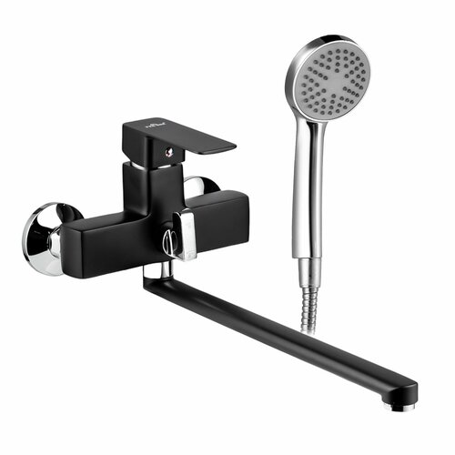Смеситель для ванной длинный излив 35 см с душевым набором, черный сированным дивертором