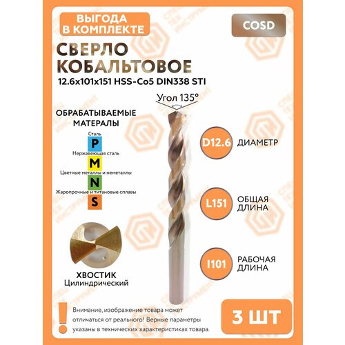 Сверло кобальтовое 12.6x101x151 HSS-Co5 DIN338 3 штуки "СпецТехИнструмент"