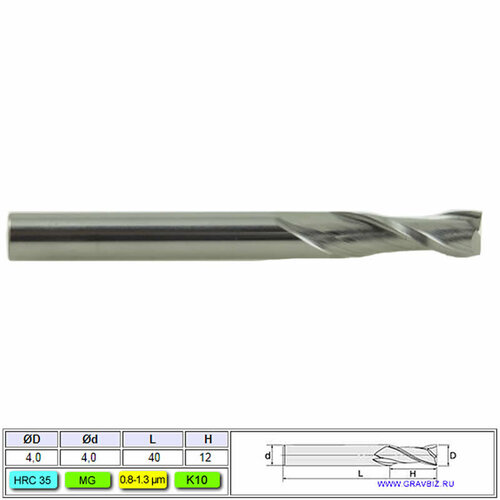 Фреза концевая спиральная 2 зуба торец Ø4х32 хвостовик Ø4х60 твердость HRC35