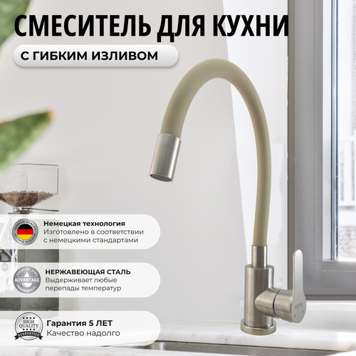 Смеситель для кухни с гибким изливом бежевый. Сатин. Кухонный кран для мойки. Нержавеющая сталь