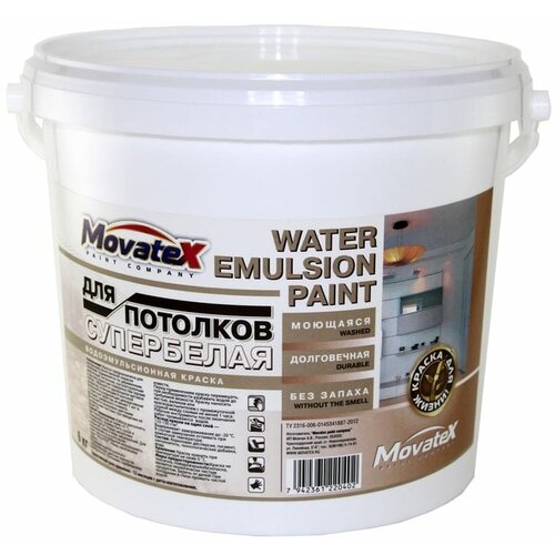 Водоэмульсионная краска для потолков Movatex супербелая, моющаяся, 6 кг Т02323