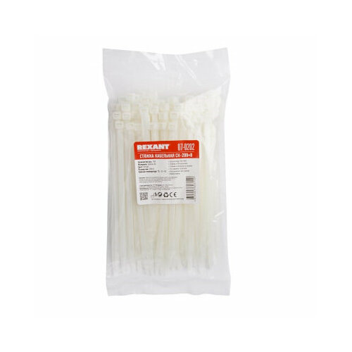 Хомут-стяжка нейлоновая REXANT 300x7,6 мм, 100 шт, белая (5уп)