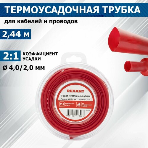 Термоусадочная красная трубка REXANT 5.0/2.5 мм для проводов, 2.44 м в боксе