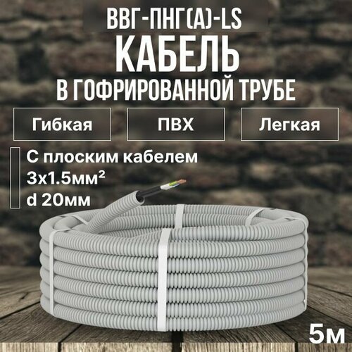 Кабель в гофре DKC Premium ВВГ-Пнг(А)-LS 3х1.5 Конкорд ГОСТ +, ПВХ серая D20 мм - 5м