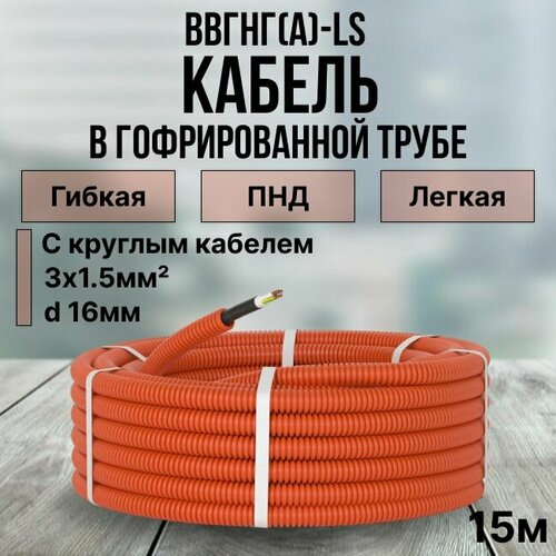 Кабель в гофре DKC Premium ВВГ-нг(А)-LS 3х1.5 Конкорд ГОСТ +, ПНД оранжевая d16 мм - 15м