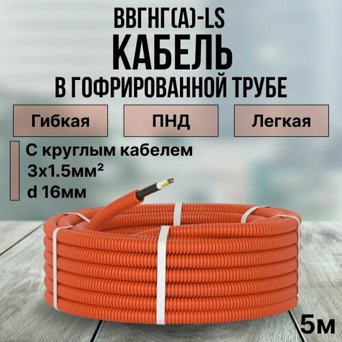 Кабель в гофре DKC Premium ВВГ-нг(А)-LS 3х1.5 Конкорд ГОСТ +, ПНД оранжевая d16 мм - 5м