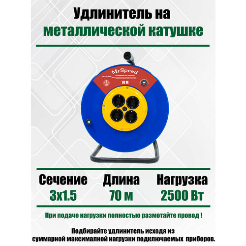 Силовой удлинитель на металлической катушке ПВС ТУ 3х1,5 mm 70 Метров/ 4 Розетки/ С/З