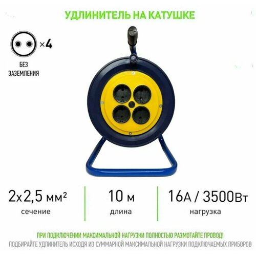 Силовой удлинитель на пластиковой катушке ПВС 2х2,5 mm 10 Метров/ 4 Розетки/ Без заземления