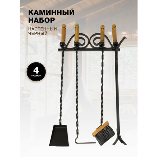 Каминный набор Настенный, 4 предмета, деревянные ручки, черный.