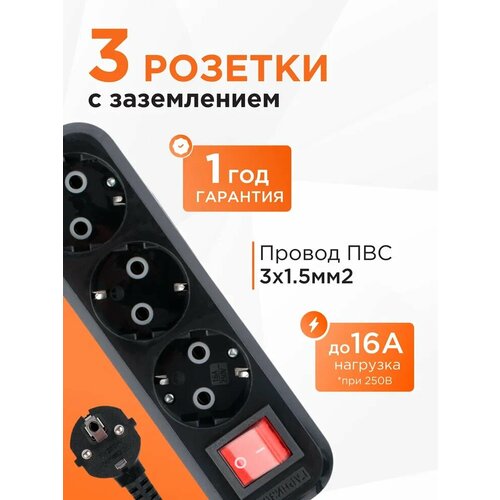 Сетевой фильтр-удлинитель Гарнизон черный 3 розетки 16 А с заземлением 15 метров