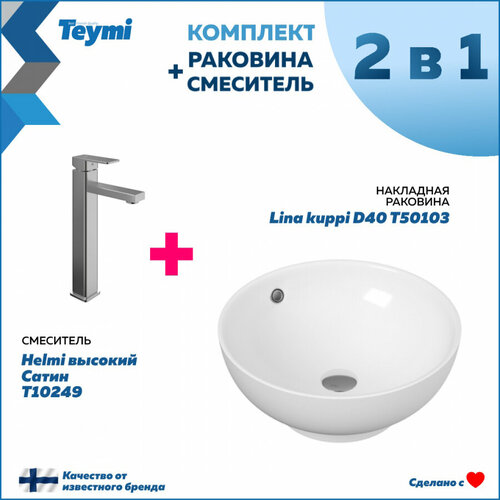 Комплект Teymi: Раковина Lina kuppi D40 + смеситель Helmi высокий, сатин F00251