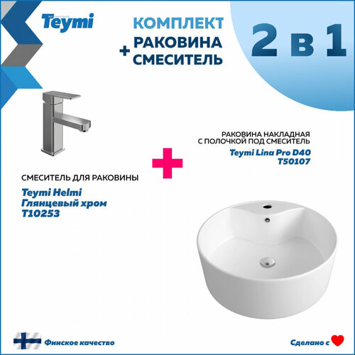 Комплект Teymi: Раковина Lina Pro D40 с полочкой + смеситель Helmi, глянцевый хром F00218
