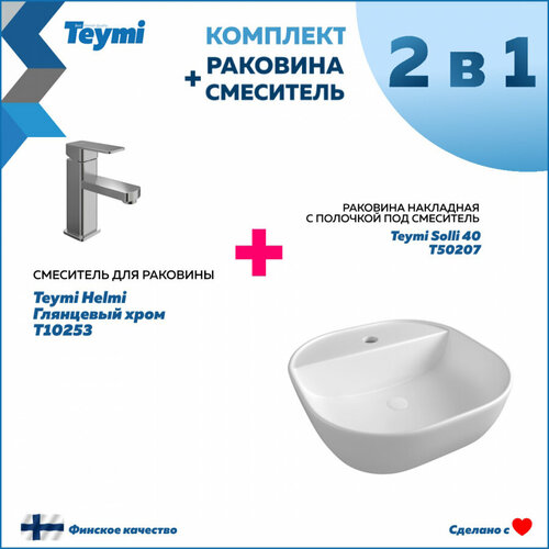 Комплект Teymi: Раковина Solli 40 с полочкой + смеситель Helmi, глянцевый хром F00220