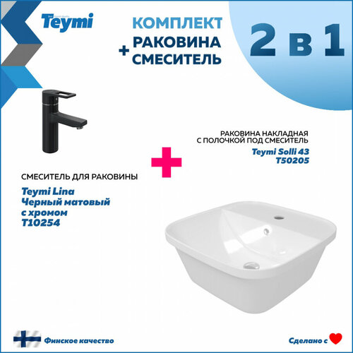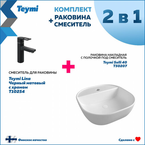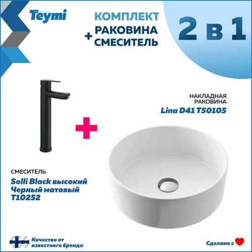 Комплект Teymi: Раковина Lina D41 + смеситель Solli Black высокий, матовый F00295