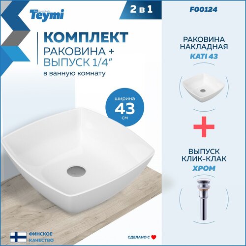 Комплект Teymi 2 в 1: Раковина Kati 43 накладная T50701 + выпуск для раковины 1/4", клик-клак, T90901 хром F00124
