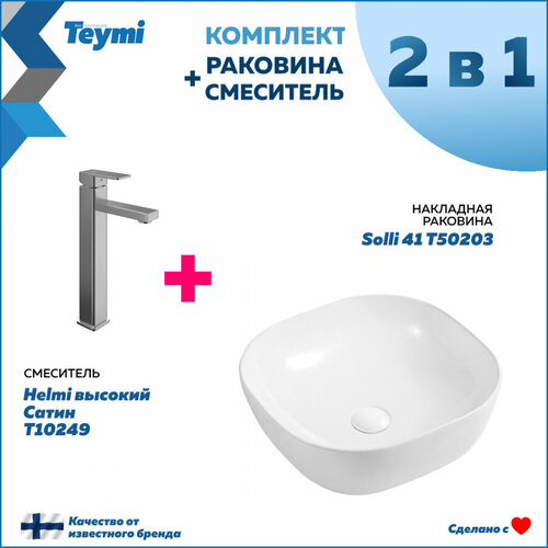 Комплект Teymi: Раковина Solli 41 + смеситель Helmi высокий, сатин F00242