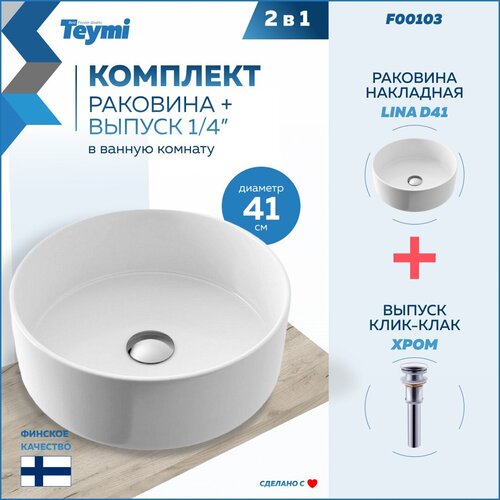 Комплект Teymi 2 в 1: Раковина Lina D41 накладная T50105 + выпуск для раковины 1/4", клик-клак, T90901 хром F00103