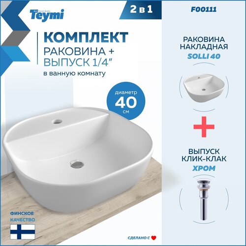 Комплект Teymi 2 в 1: Раковина Solli 40 накладная с полочкой T50207 + выпуск для раковины 1/4", клик-клак, T90901 хром F00111