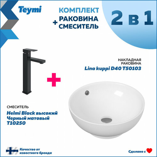 Комплект Teymi: Раковина Lina kuppi D40 + смеситель Helmi Black высокий, матовый F00271