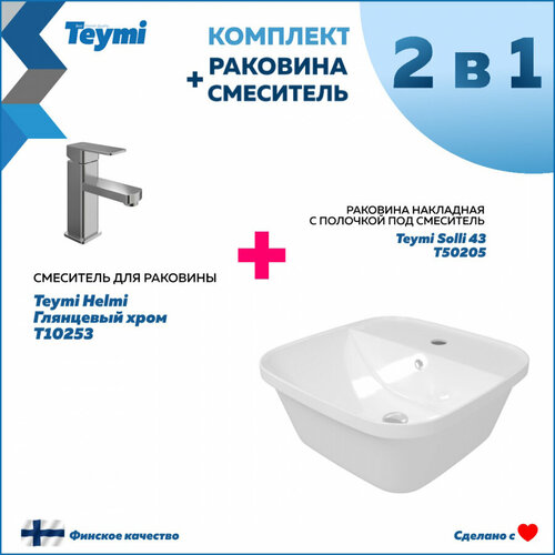 Комплект Teymi: Раковина Solli 43 с полочкой + смеситель Helmi, глянцевый хром F00221