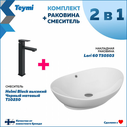 Комплект Teymi: Раковина Lori 60 + смеситель Helmi Black высокий, матовый F00269