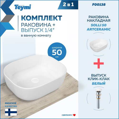Комплект Teymi 2 в 1: Раковина Solli 50 artceramic накладная T50204 + выпуск для раковины 1/4", клик-клак, T90902 F00138