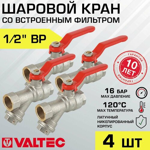 Кран шаровой 1/2" вн-вн (4 шт) VALTEC COMBI со встроенным фильтром и стальной рукояткой, арт. VT.292. N.04