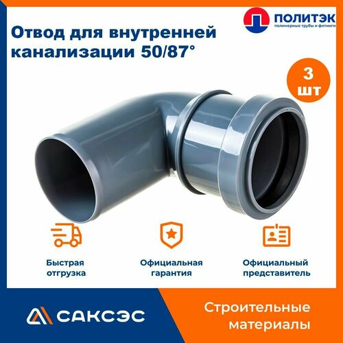 Отвод для внутренней канализации 50/87 полипропиленовый, Политэк, 3шт.