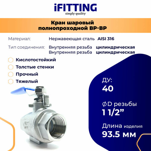 Кран шаровый нержавеющий Ду 40 11/2" вр/вр тяжелый усиленный муфтовый полнопроходной кислотостойкий 2PC AISI 316