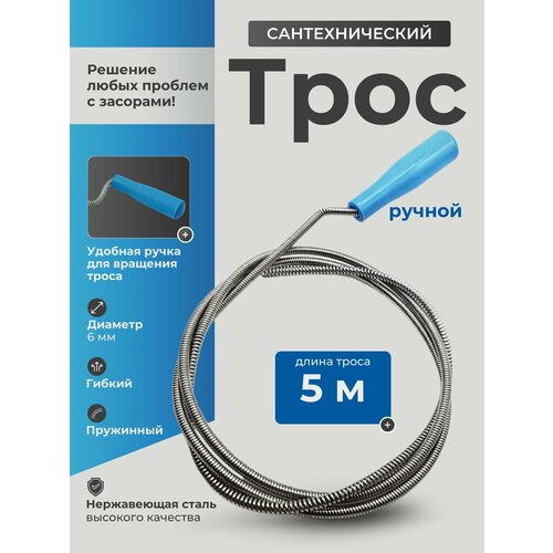Трос сантехнический ручной 5 м для прочистки канализационных труб от засоров, стальной металлический трос диаметром 6мм для чистки канализации, унитаза, дымохода