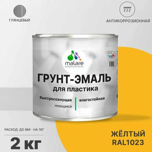 Грунт-Эмаль, Краска Malare 3 в 1 для пластика, окон и подоконников, сайдинга, быстросохнущая, глянцевый, желтый, 2 кг.