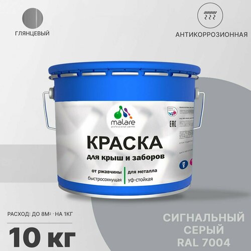 Краска Malare для металлического забора, для крыши из металла, для металлочерепицы, антикоррозионная, глянцевый, сигнальный серый, 10 кг.