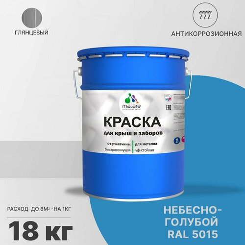 Краска Malare для металлического забора, для крыши из металла, для металлочерепицы, антикоррозионная, глянцевый, небесно-голубой, 18 кг.