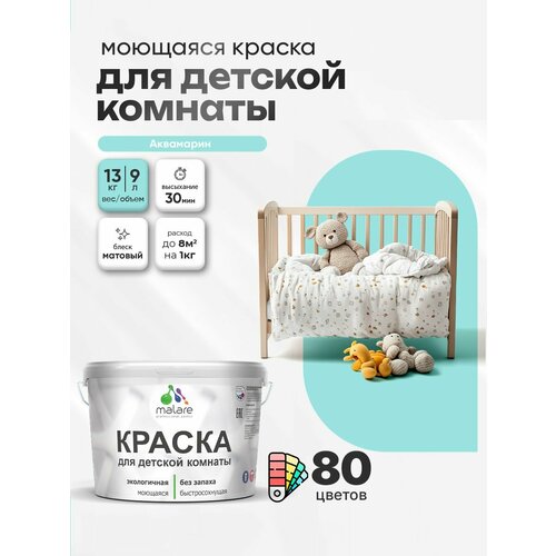 Краска акриловая (АК) Malare Краска Malare интерьерная для детской комнаты, для стен и обоев, для потолка, акриловая без запаха моющаяся матовая, аквамарин (9л - 13кг) матовая аквамарин 9 л 13 кг