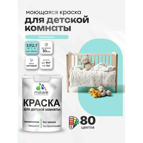 Краска акриловая (АК) Malare Краска Malare интерьерная для детской комнаты, для стен и обоев, для потолка, акриловая без запаха моющаяся матовая, аквамарин (2.7л - 3.9кг) матовая аквамарин 2.7 л 3.9 кг