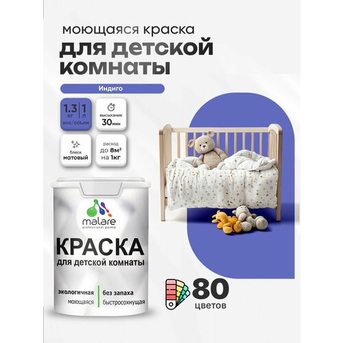 Краска акриловая (АК) Malare Краска Malare интерьерная для детской комнаты, для стен и обоев, для потолка, акриловая без запаха моющаяся матовая, индиго (1л - 1.3кг) матовая индиго 1 л 1.3 кг