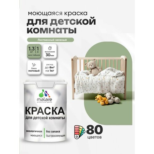 Краска акриловая (АК) Malare Краска Malare интерьерная для детской комнаты, для стен и обоев, для потолка, акриловая без запаха моющаяся матовая, лиственный (1л - 1.3кг) матовая лиственный 1 л 1.3 кг