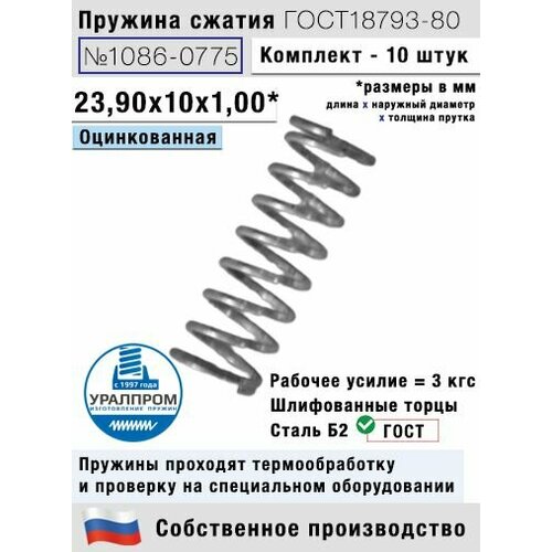 Пружина сжатия 1086-0775, L 23,90 мм; d 1,00 мм; D 10 мм ГОСТ 18793-80 (комплект 10 штук)