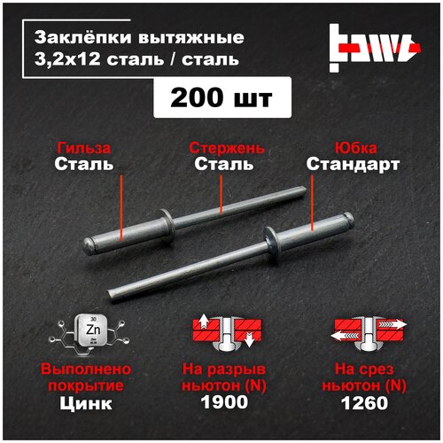 Заклёпки вытяжные, для заклёпочника, стальные 3,2х12 200 шт