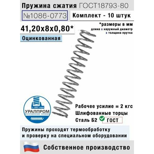 Пружина сжатия 1086-0773, L 41,20 мм; d 0,80 мм; D 8 мм ГОСТ 18793-80 (комплект 10 штук)