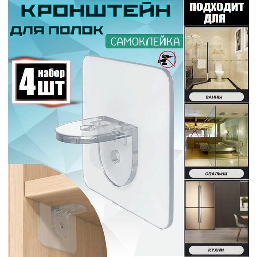 Уголки для полок прозрачные крючки самоклеющиеся влагостойкие для ванной комнаты и кухни, 4шт