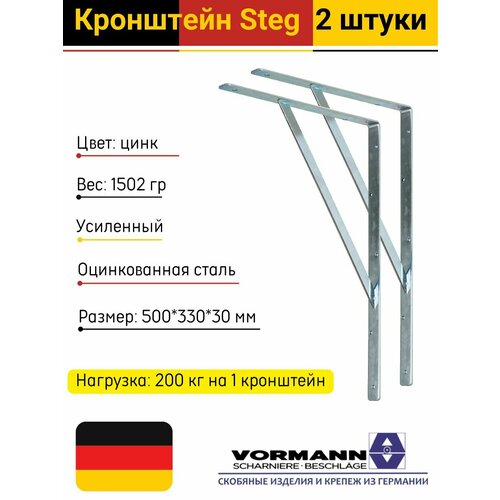 Кронштейны Vormann Steg усиленные 500х330х30х4 мм, сталь оцинкованная, нагрузка до 200 кг, 2 шт.