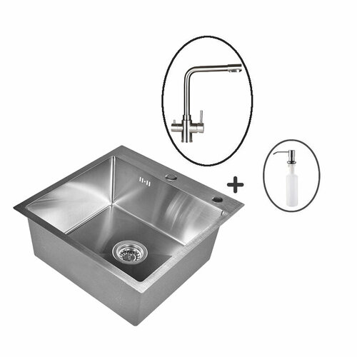 Комплект кухонная мойка из нержавеющей стали WISENT WGS35050 (50х50 см) со смесителем и дозатором