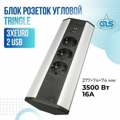 Блок розеток угловой Tringle 3 розетки, 2 USB, с удлинителем, серебристо-черный